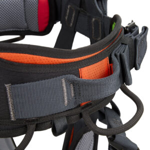 The breathable mesh padding, differentiated padded leg loops and color-coded markings (green = right, red = left) ensure comfort and ease of use. Adjustable elastic straps on the back allow the leg loops to be individually positioned. The side EN 358 attachment points are marked with orange markings, the rear “R”-marked point is used exclusively for connecting a restraint system.